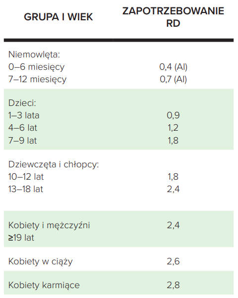 Tabela 2. Zapotrzebowanie na kobalaminę na poziomie zalecanego dziennego spożycia (RDA) i wystarczającego spożycia (AI)9